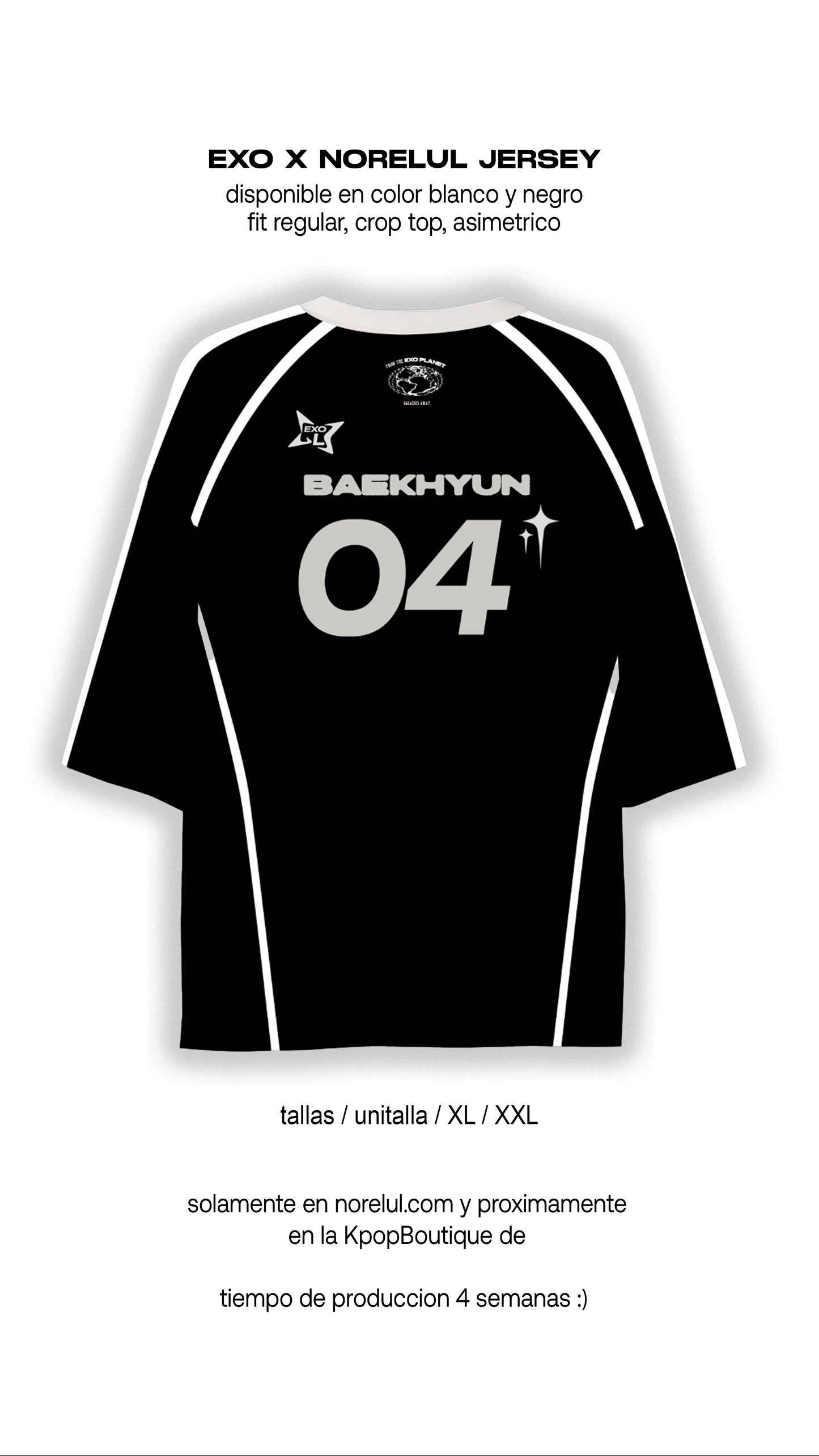 Jersey tipo deportivo creado y producido por Norelul en México inspirada en la esencia del grupo kpop Exo . Esta playera de cuello en V con manga corta en fit oversize para sentirte cómodo y suelto, esta realizada en un material 100% poliéster de una alta gama y cálidad para la resolución óptima de nuestros estampados así como un tacto suave al momento de tener interacción con tu piel.