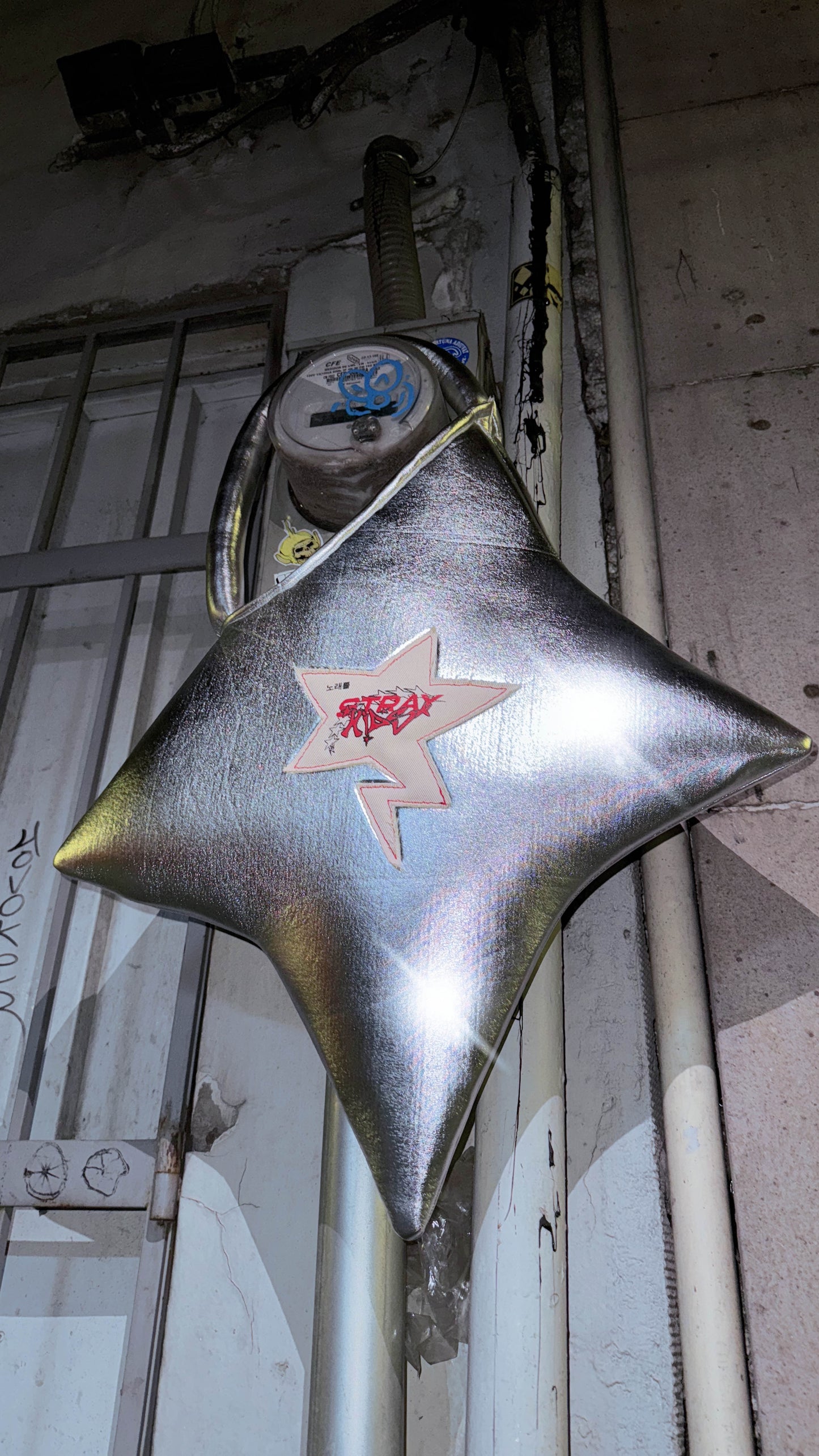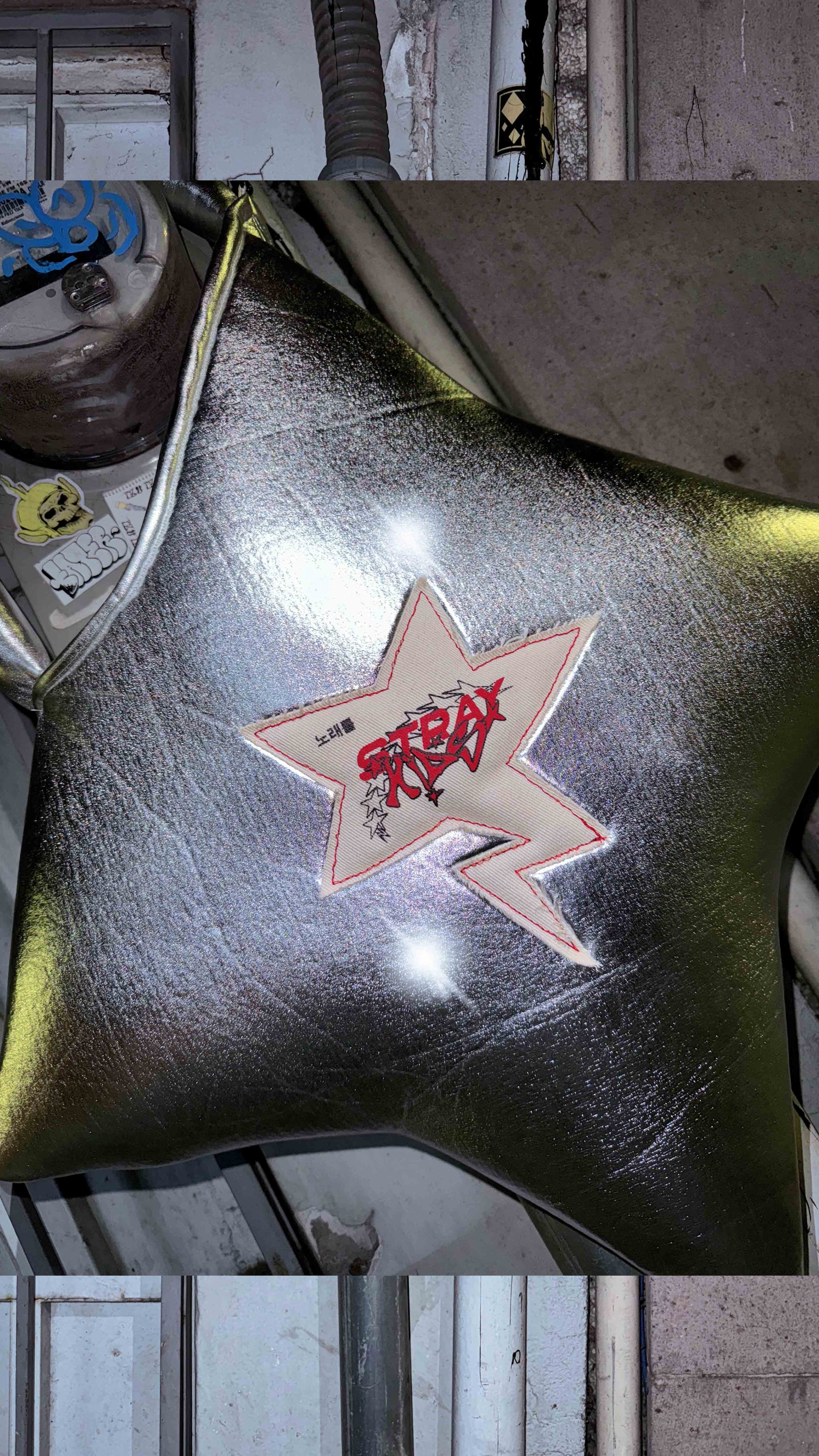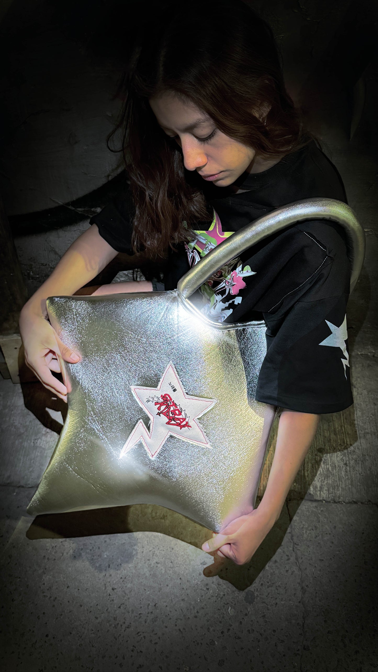 Bolsa Tote Bag única y originalmente creada y producida por Norelul en México inspirada en la esencia del grupo kpop Stray Kids. Realizada en material 100% poliéster de una alta gama y cálidad , de peso liviano en forma de una estrella , figura representativa del grupo Stray Kids, junto a un parche en forma de estrella con el logo intervenido por Norelul.