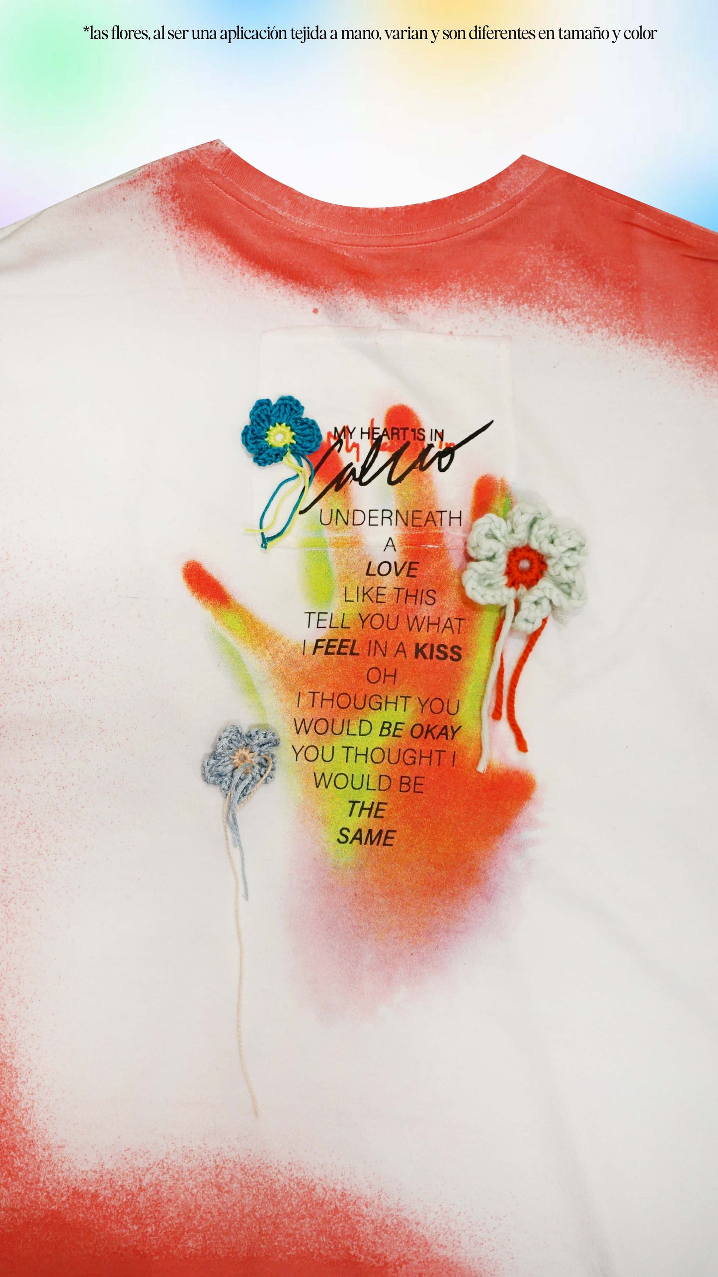 Playera de cuello redondo y manga corta en tela de punto con composición de algodón y poliéster peinado para una suavidad extrema. Esta playera esta realizada en nuestro fit Oversize Boxy con hombro caído y un extra de tela para que de un look cómodo y cool con la caída del corte. Los estampados de esta prenda están realizados en serigrafia además de un teñido manual y unas flores tejidas a mano que le dan profundidad al concepto total.