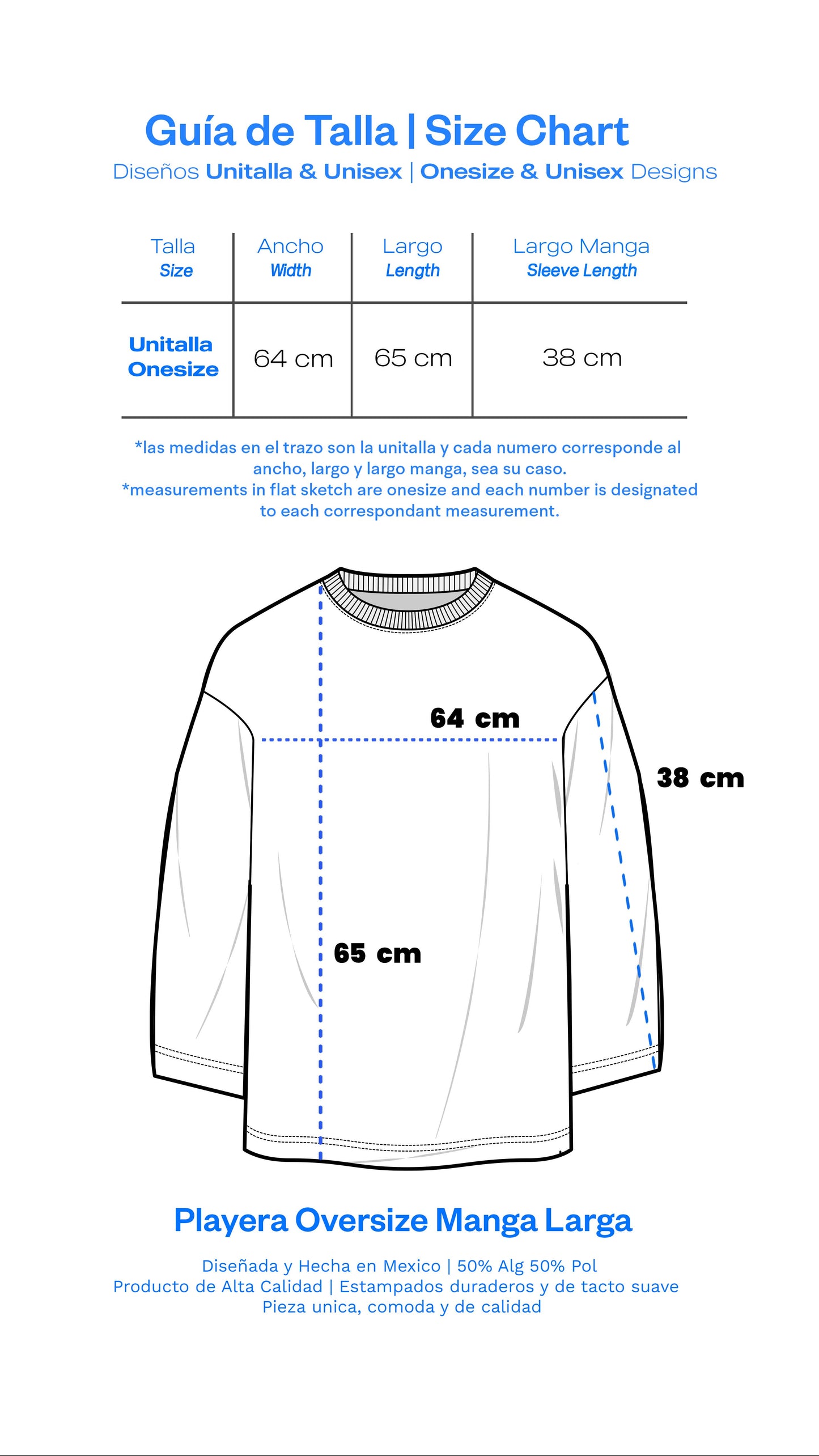 Nuestra playera manga larga surge de verla constantemente como parte clave que refleja el look easy going de nuestro idols favoritos y es un must en sus looks, asi mismo como prenda de temporada en este otoño-invierno 2024. Realizada en cuello redondo y manga larga en tela de punto con composición de algodón y poliéster peinado para una suavidad extrema. Esta playera esta realizada en nuestro fit Oversize con hombro caído lo cual hace que sea una prenda super cómoda pero sobretodo cool con la caída del corte y el extra de tela que lleva. Los estampados de esta prenda están realizados en impresión digital para una resolución óptima de estos.